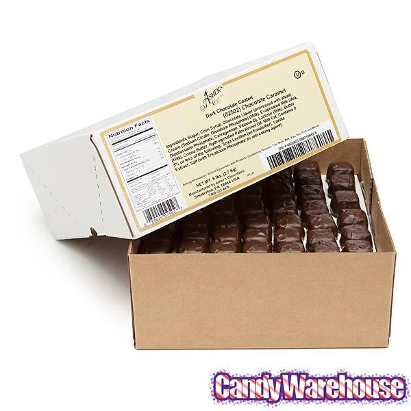 Box contains 6 pounds of Dark Chocolate Covered Chocolate Caramels Candy… that’s about 180 pieces.