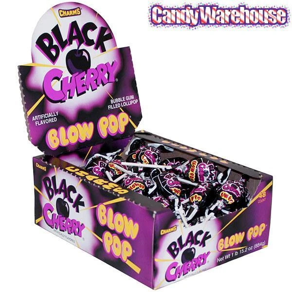 Display box contains 48 Charms Black Cherry Blow Pops.