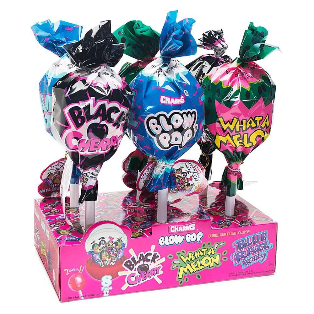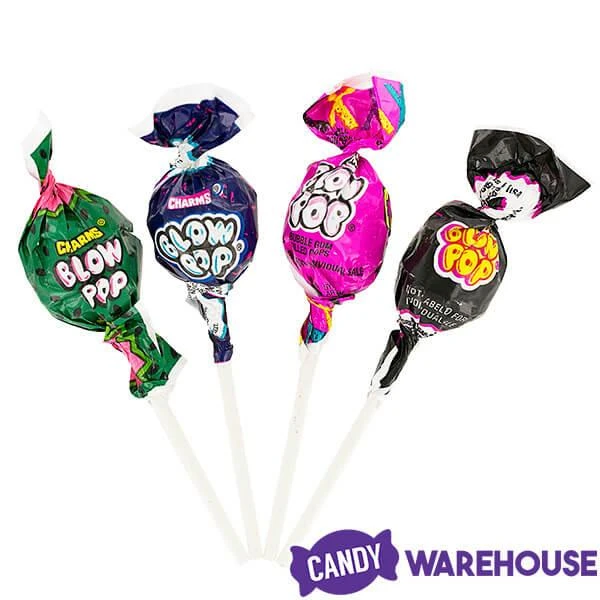 Maintain your reputation for being the hippest parent in the ‘hood by procuring this epic 6-piece display of Charms Giant Blow Pops – Fun Flavors for your kid’s party. Little people go nuts for these gargantuan Giant Blow Pops containers that lead to enormous laughs and massive amounts of fun. Each of the six prodigious plastic pops contains eight bubble gum filled lollipops — enough to make 48 excited kids hugely happy. Luscious fruit flavors lurking inside the regular-size Blow Pops lollipops include Blue Razz Berry, Black Cherry, and What a Melon. Each sucker delivers a mighty sweet hard candy shell encasing a Charms gum center for hours of bubblicious fun. Count on Candy Warehouse to carry all the classic Charms Blow Pops you love most in single-flavor and taste-bud-tantalizing assortment boxes.