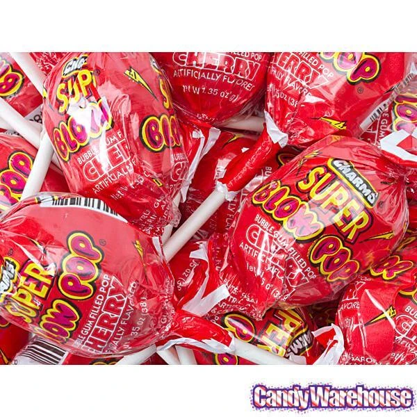 Set contains 72 Cherry Charms Super Blow Pops Fun House Lollipops with a refillable container.