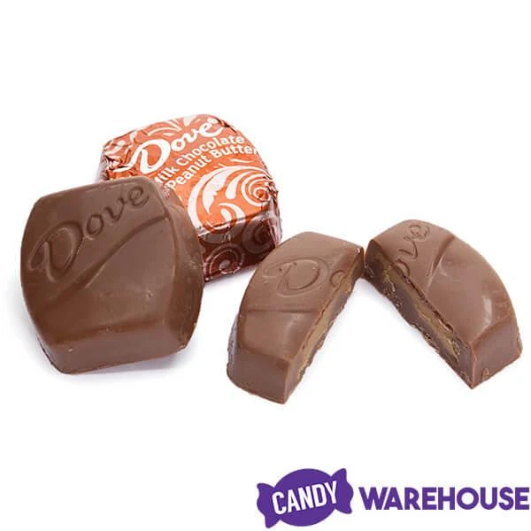 Bag contains 7.61 ounces of Orange Foil Wrapped Dove Milk Chocolate Peanut Butter Squares… that’s about 28 pieces.
