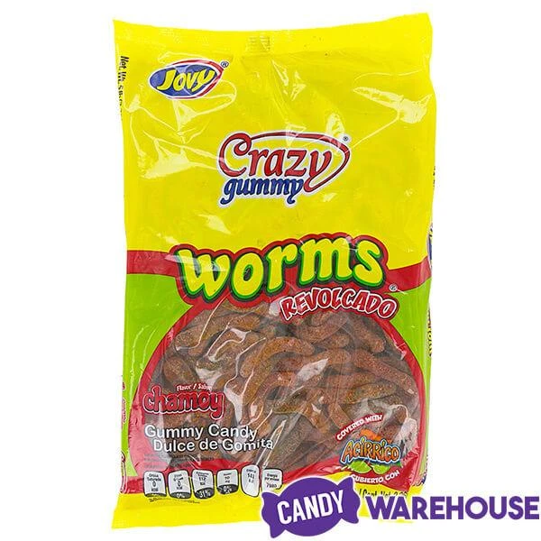 Bag contains 5 pounds of Jovy Crazy Gummy Worms Revolcado Chamoy Candy.