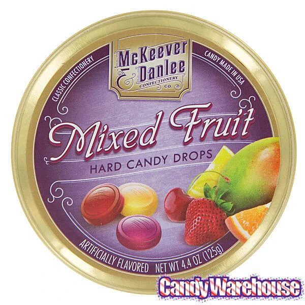 Display box contains 6 McKeever & Danlee Mixed Fruit Candy Bon Bons Tins, each with a net weight of 4.4 ounces.