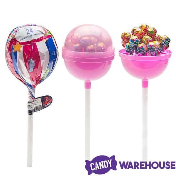Reminiscent of the big hot air balloons that flout up into the sky, these giant lollipops are impressive and full of 24 fruity suckers! The perfect center pieces for birthday parties and other celebrations, mega lollipops are sure to surprise and delight when they discover the full bounty of candy hidden inside. Simply unwrap the giant lollipop and crack open the plastic container to release the treasure trove of sweet suckers.