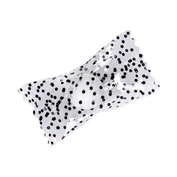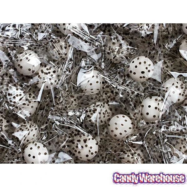 Delicious white mint centers are surrounded with a layer of milk chocolate and then coated with a thin candy shell of bright white. These mint chocolate balls are then sealed inside clear wrappers with dainty black dots. Perfect for formal occasions!