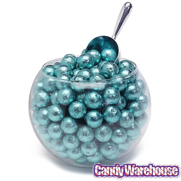 Bag contains 5 pounds of Robin Egg Blue Foiled Caramel Filled Chocolate Candy Balls.