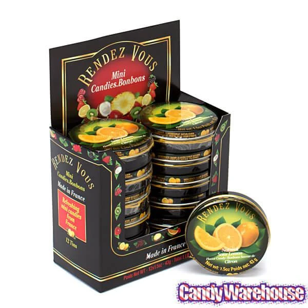Display box contains 12 Rendez Vous Sour Lemon Mini Bon Bons Candy Tins.