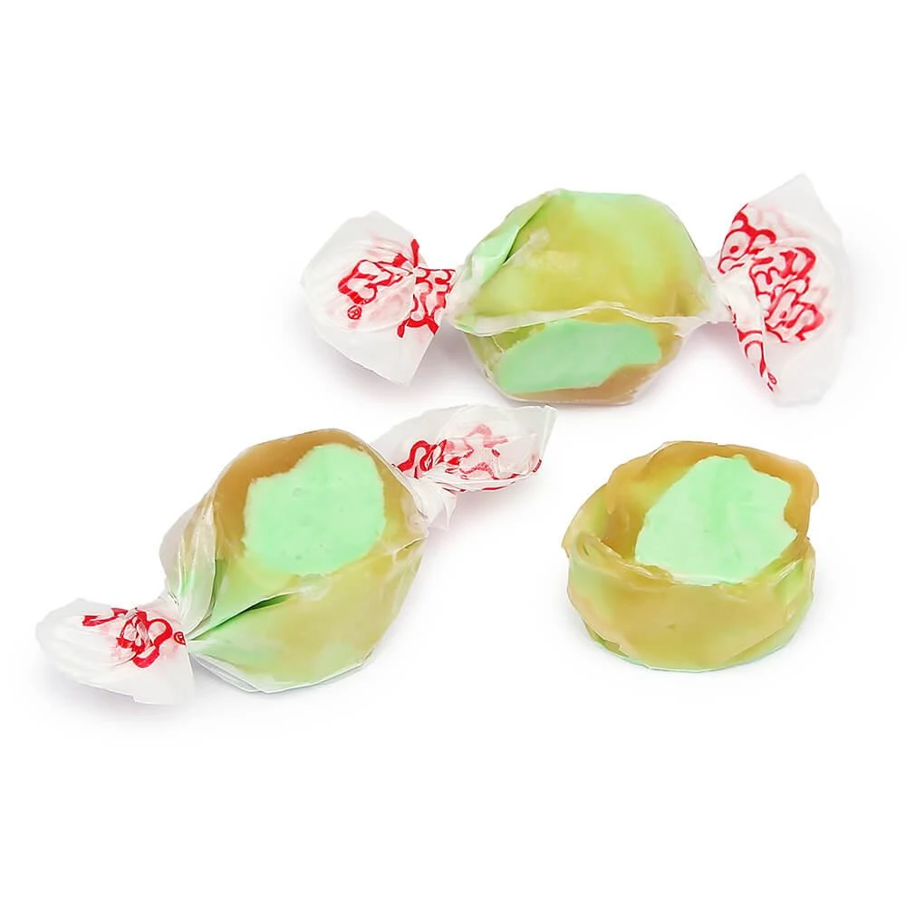 Bag contains 2.5 pounds of Gourmet Caramel Apple Salt Water Taffy Candy.