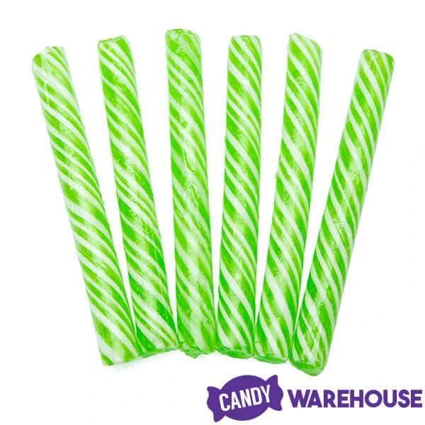 Jar contains 50 individually wrapped Green Sweet Spindles Mini Hard Candy Sticks.