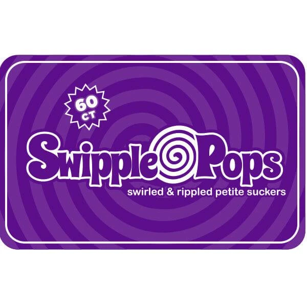 Resealable tub contains 60 individually wrapped Purple Swipple Pops Petite Swirly Ripple Lollipops.