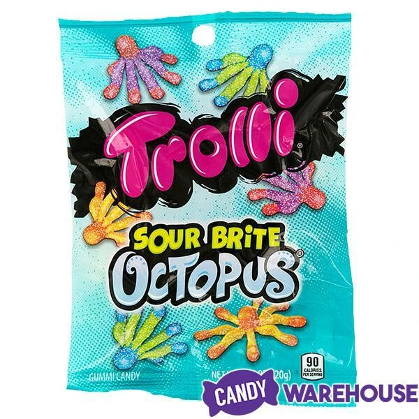 Box contains 3 pounds of Trolli Sour Brite Gummi Octopus Candy packed in 12 bags, each with a net weight of 4.25 ounces.