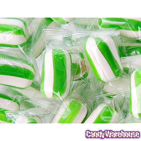 Bag contains 5 pounds of Green Sassy Cylinders Striped Candy.
